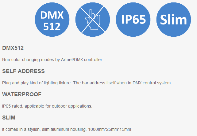 20 Pixel Bar Linear Pixel Bar IP65 Aluminum Bar RGB Tube DMX Rigid Bar LED Rigid Bar DMXLED Bar Aluminum Rigid Bar LED RGB Linea adopt SMD5050 RGB as light source. It is aluminum case waterproof DMX IC rgb tube 60leds rigid bar, DMX led rigid bar. Good heat dissipation and high waterproof degree can be used to outdoors. LED bars can...
